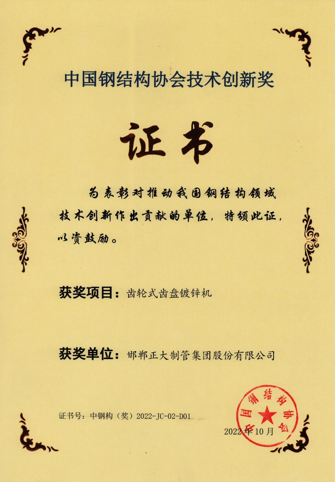 近日,中國(guó)鋼結(jié)構(gòu)大會(huì)暨粵港澳大灣區(qū)鋼結(jié)構(gòu)發(fā)展峰會(huì)在廣州召開(kāi),會(huì)上對(duì)獲得中國(guó)鋼結(jié)構(gòu)協(xié)會(huì)2022年度科學(xué)技術(shù)獎(jiǎng)的單位頒獎(jiǎng),正大制管申報(bào)的《齒輪式齒盤鍍鋅機(jī)》項(xiàng)目獲得中國(guó)鋼結(jié)構(gòu)協(xié)會(huì)“技術(shù)創(chuàng)新獎(jiǎng)”。